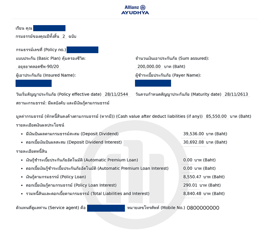 - รายละเอียดหนี้สิน (หากมี) เงินกู้ชำระเบี้ยประกันอัตโนมัติ และเงินกู้ตามกรมธรรม์